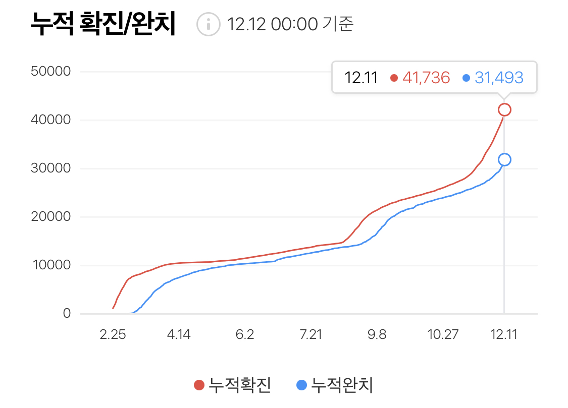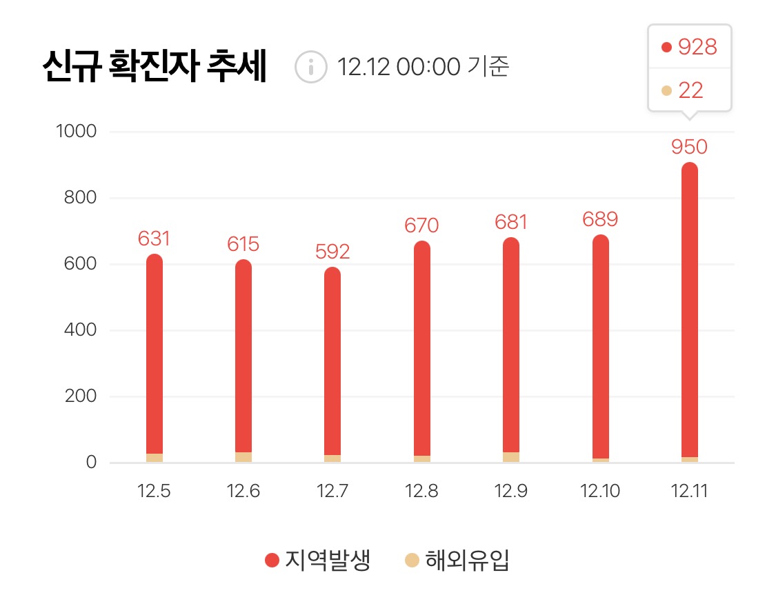 12/12일 코로나 19 신규 환자는 950명. 지난 1월 첫 확진자 발생 이후 최고치를 경신했다.