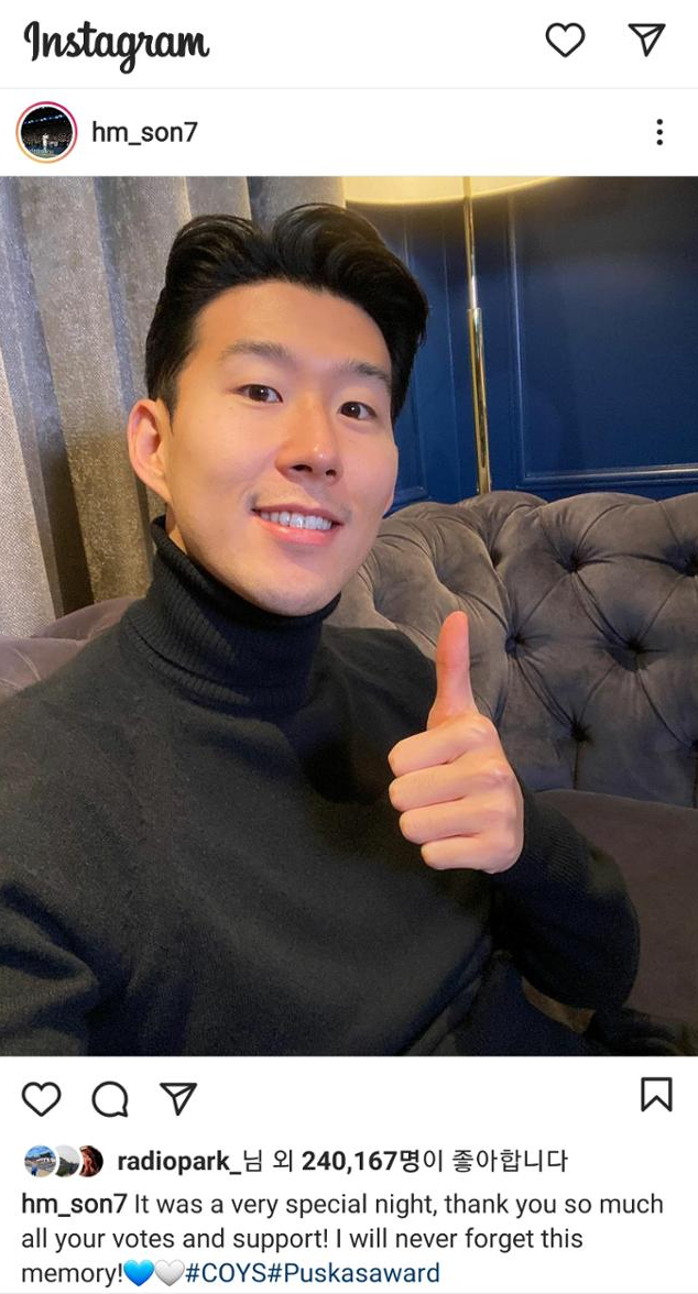 수상 소식에 손흥민은 기쁨을 감추지 않았습니다. 자신의 SNS에 "아주 특별한 밤" 이라며 "투표하고 지지해 주신 모든 분께 고맙다". "오늘은 절대 잊지 못할 것"이라고 적었습니다.
