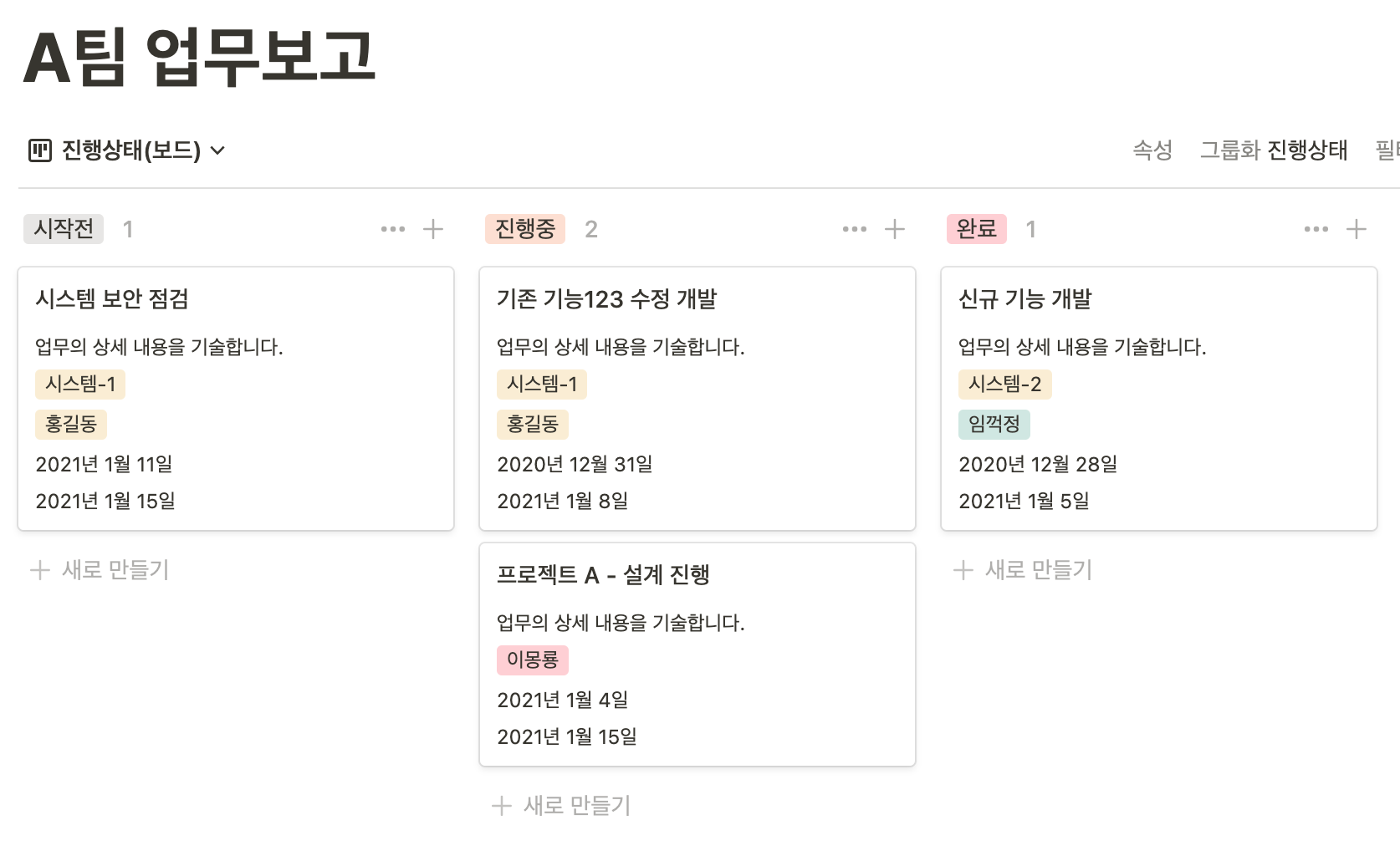 또, 팀 내부 회의용으로 업무 진행 상태를 기준으로 하는 보기도 추가했습니다. (그룹화 속성 - 진행상태)