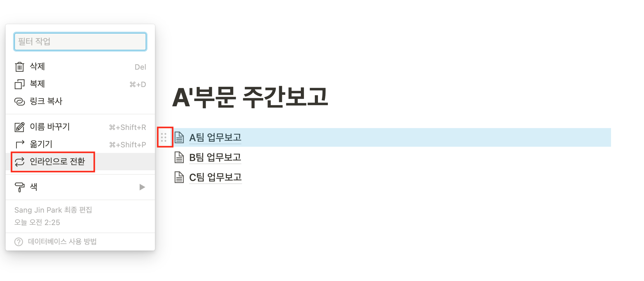 팀 단위 업무보고 페이지를 "인라인으로 전환"하게 되면