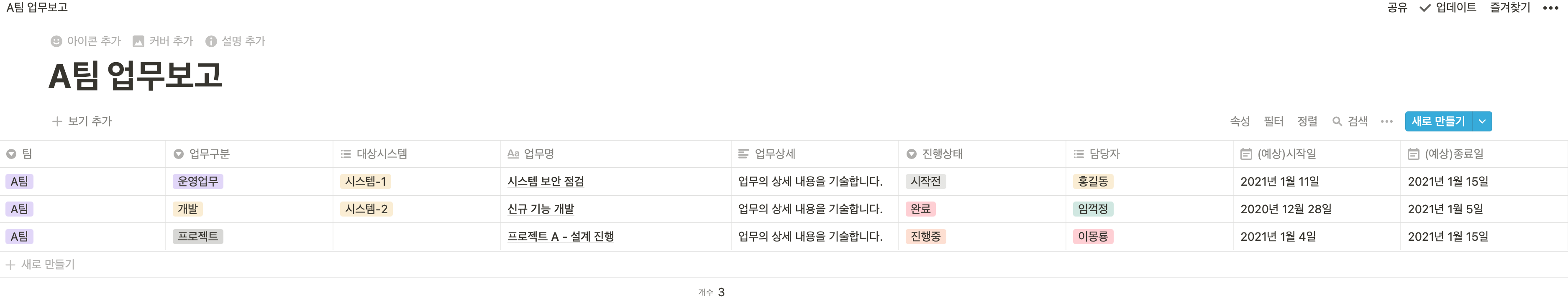 업무 보고에 필요한 속성들이 추가되었으면 이제 현재 진행 중인 업무들을 기록하면 됩니다. 저는 업무기록을 History 관리용으로 사용하기 위해 삭제하지 않고, 1개의 Task(업무)를 1개의 Row로 누적해서 관리할 예정입니다. 매주 추가되는 업무내용은 상세 내용에 +Add 하는 식으로 관리하면 될 것 같습니다.