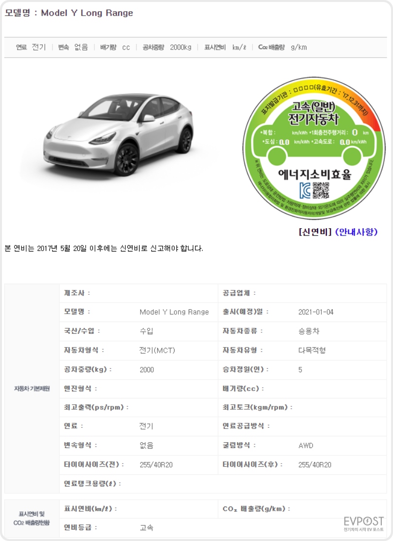 암튼, 원래는 국내 인증 소식을 전하려고 했었는데요. "한국 에너지 공단"에 업데이트된 정보에 따르면 모델 Y의 주행거리가 "511Km"로 등록되었습니다!