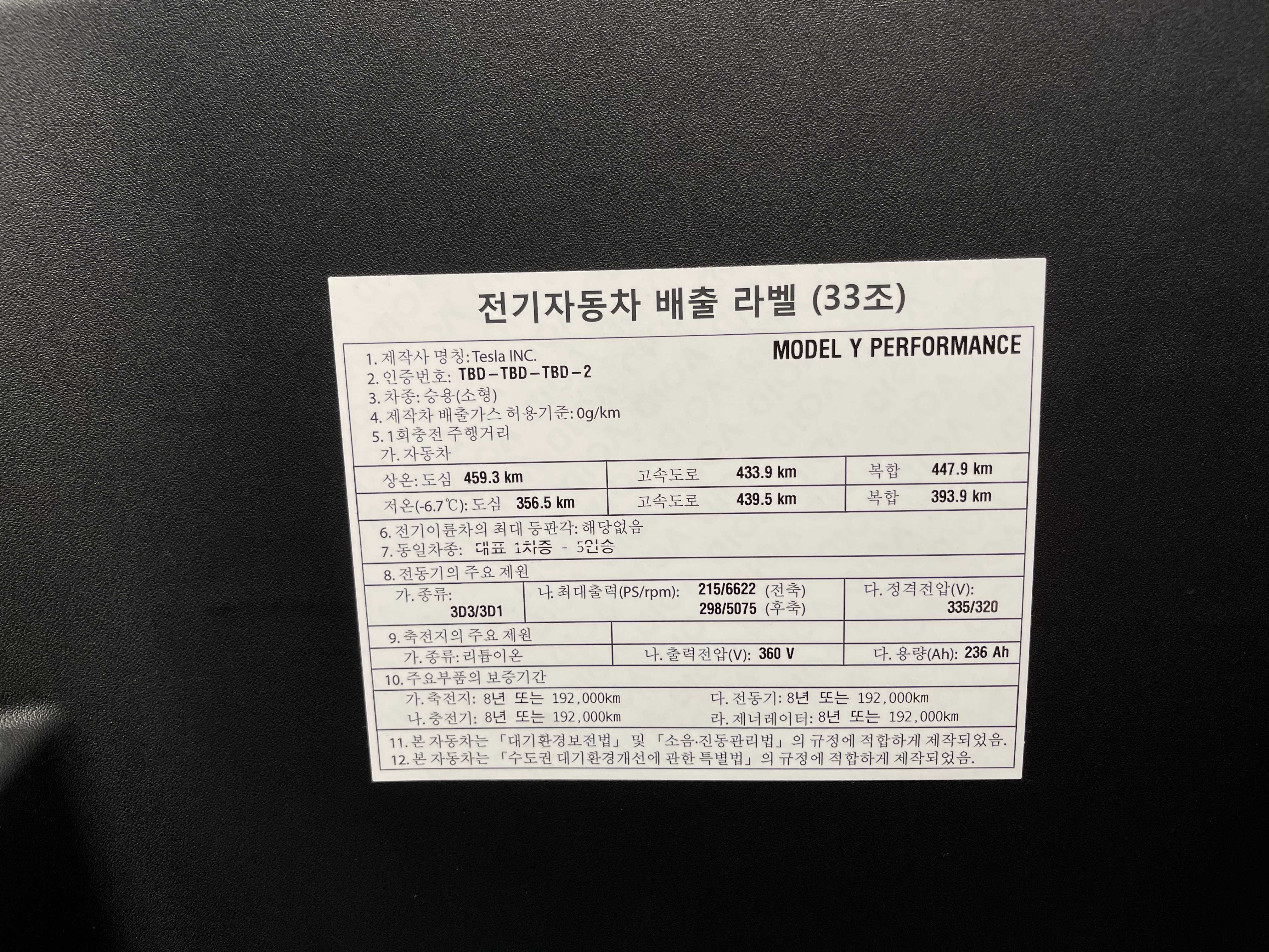 앞모습은 그냥 모델 3 와 같다고 보셔도 무방합니다. 조금 빵빵한 모델 3 라고 생각하시면 됩니다. 프렁크(프런트 트렁크)의 경우는 모델 3 대비 많이 깊어서 사용성이 좋습니다. 프렁크에 전기자동차 배출 라벨이 붙어있는데요. 1회 충전 주행거리 정보가 있습니다. 퍼포먼스라 복합 447.9 Km라고 적혀있네요. 냉간(저온) 시 393.9 Km 약 50 Km 정도 줄어드는 것으로 보이네요. (물론 영하 7도 기준이라 더 추운 요즘 같은 날씨에는 효율이 더 떨어질 수도 있습니다. 히트 펌프의 효과가 어느 정도일지 얼른 타보고 싶네요) 옆에 모델 X가 있어서 비교해 보니 높이가 살짝 낮습니다. 차체 크기는 작지만 모델 Y도 결코 작은 크기는 아니었습니다.