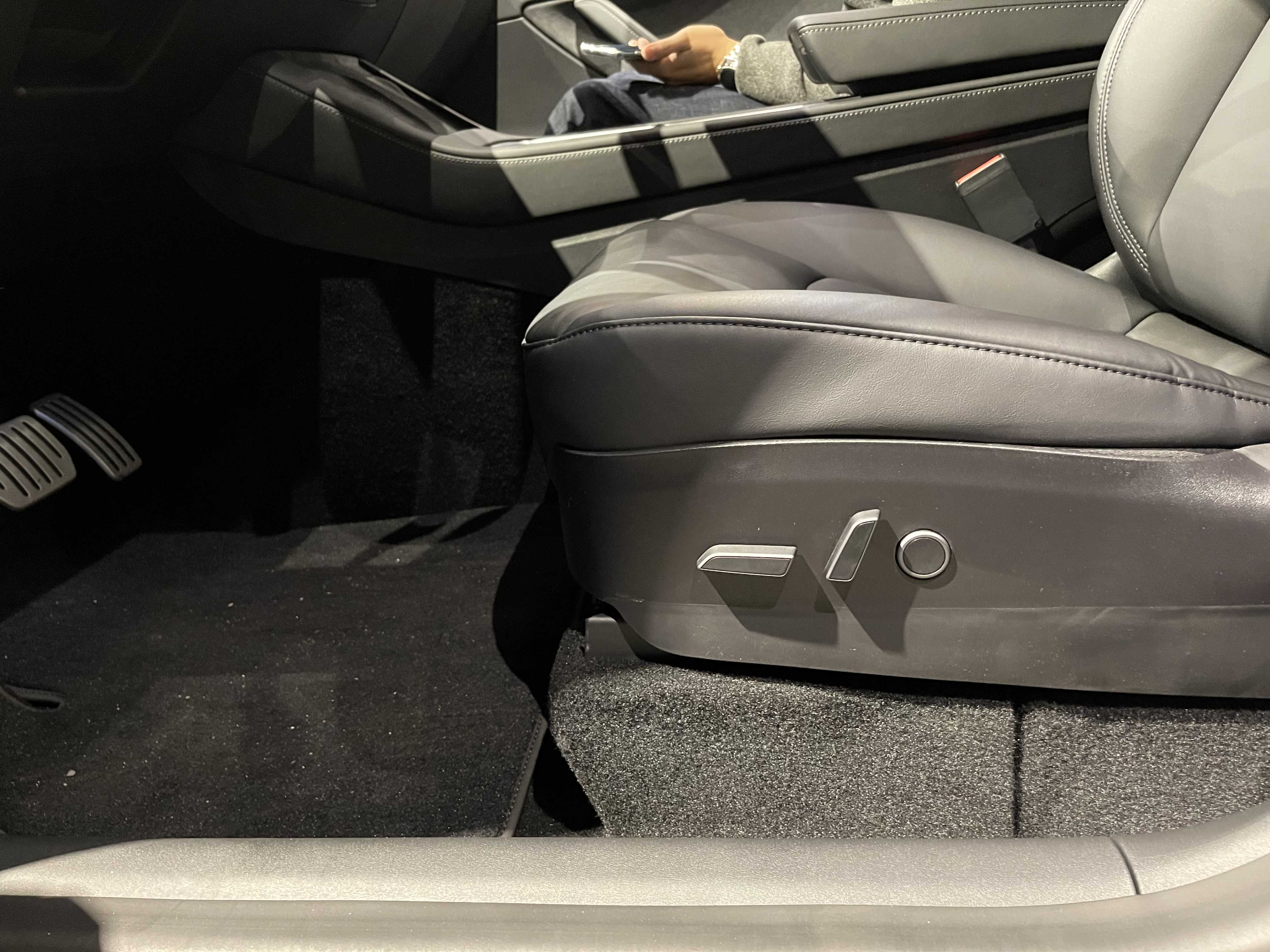 운전석 시트는 생각보다 편했습니다. 사이드 볼스터가 옆구리를 잘 잡아줬고, 요추 지지대도 있어서 편했습니다. 허벅지 부분이 조금 뜨는 게 아쉬웠습니다. 시트를 몸에 맞게 조절하기는 대기인원이 많아 어려웠습니다. 시트 및 운전석은 모델 3에서 이미 많이 본 레이아웃이라 특별하지 않았습니다.