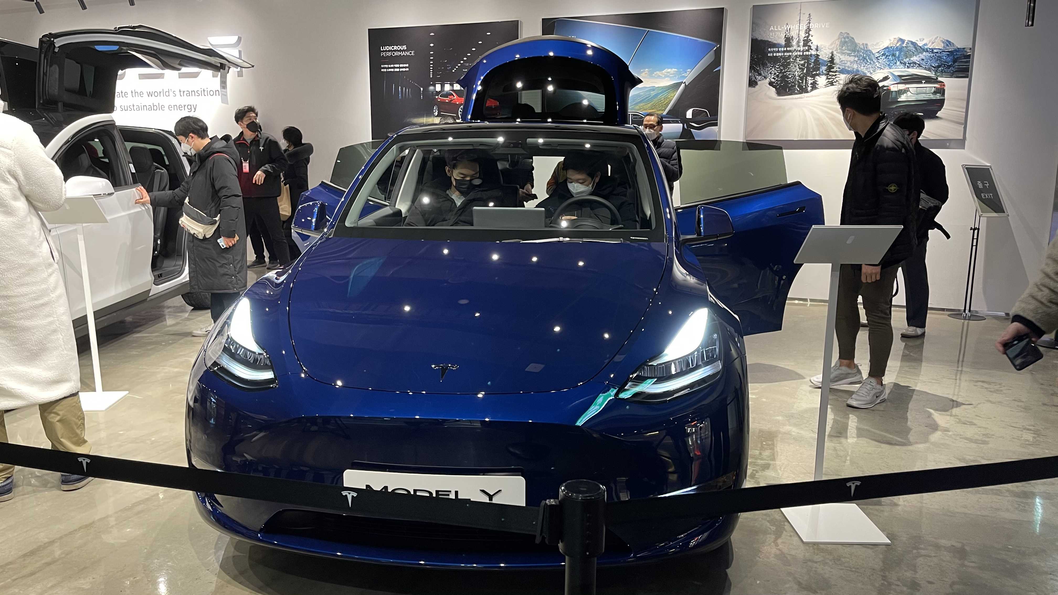 20분 정도 대기해서 부스안으로 들어갈 수 있었어요. 영등포에는 모델 Y(퍼포먼스, 롱레인지) 2대가 전시됐습니다. 모델 S, 모델 3, 모델 X, 모델 Y 순으로 "SEXY"로 전시돼있었습니다.