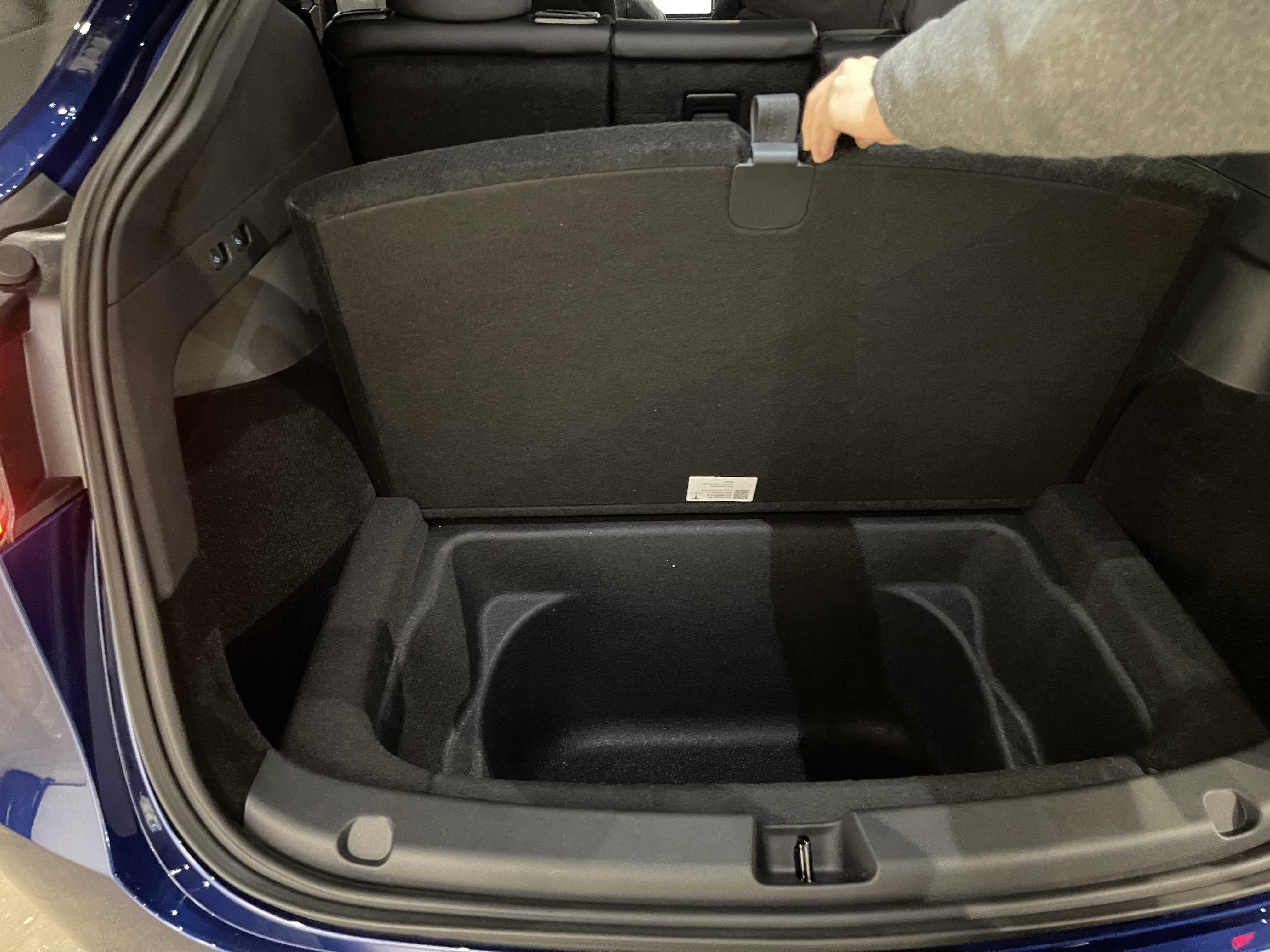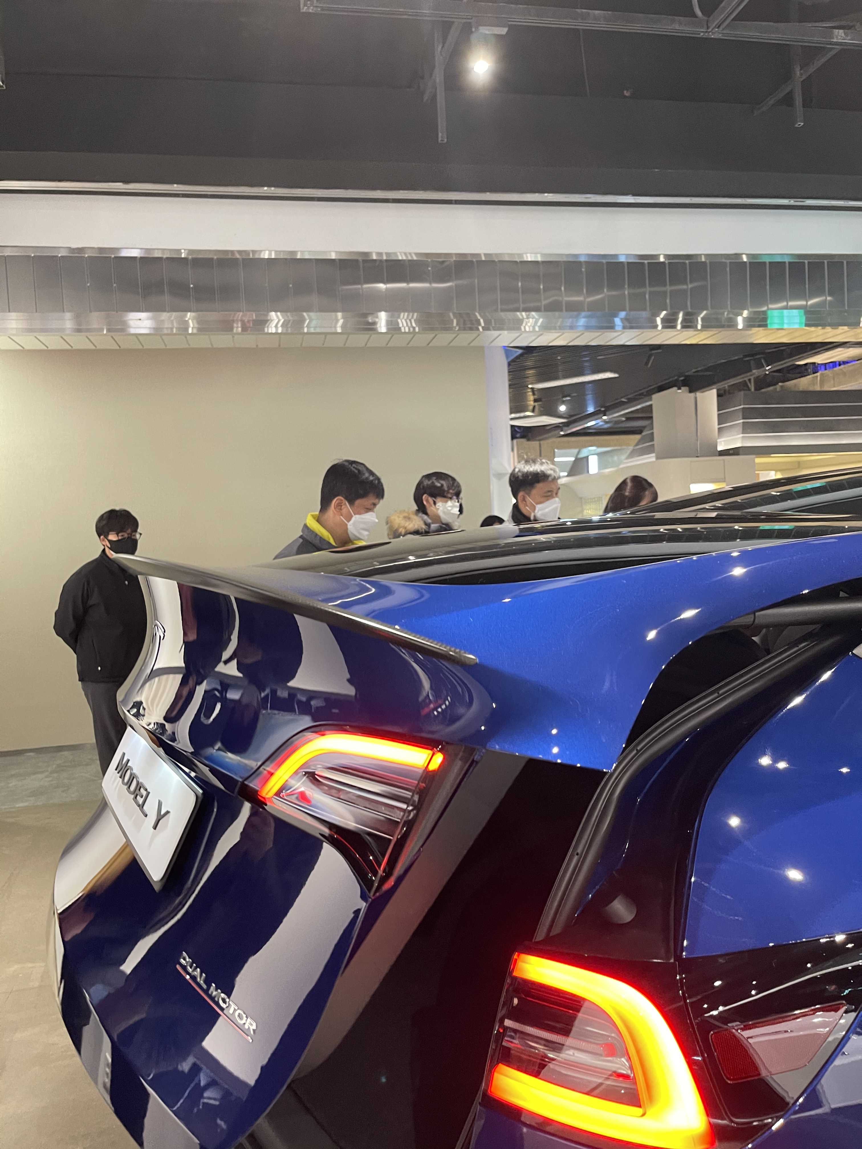뒷모습은 트렁크 부분의 높이 자체가 SUV이다 보니 높습니다. 퍼포먼스 모델이라 리어 카본 스포일러도 장작 된 모습이네요. 오토 테일게이트가 적용돼서 버튼을 누르면 스르륵! 잘 올라갑니다. 발차기나 제스처를 통해 오픈하는 건 지원하지 않고요. 열린 트렁크 내부 모습은 넓습니다. 지하실? 도 엄청 깊어서 사용성이 뛰어날 것 같습니다. 전시된 모델은 5인승이라 3열이 들어가는 자리에도 지하공간이 마련되어 있습니다. 자잘한 차량용품이나 충전기, 삼각대등을 수납하기 적당해 보입니다. 2열을 접었을 때 180cm 이상의 남성들도 충분히 누을 수 있는 길이가 나옵니다. 성인 2명이 눕기에도 넉넉까지는 아니라도 충분히 가능한 수준이라 차박에도 아주 적합해 보입니다. 누웠을 때 탁 트인 뷰는 덤이겠죠. 트렁크에 2열 시트를 접을 수 있는 버튼이 2개 있습니다. (전동식 아님, 7인승은 전동이라고 하는데 3열이 자동인지 2열이 자동인지는 알려지지 않음) 테슬라 차량답게 좌/우측에 텅 빈 공간도 있고요. 트렁크는 모델 3 대비 매우 넓어서 차박이나 가족용 차로 사용하기에 너무 좋을 것 같습니다.