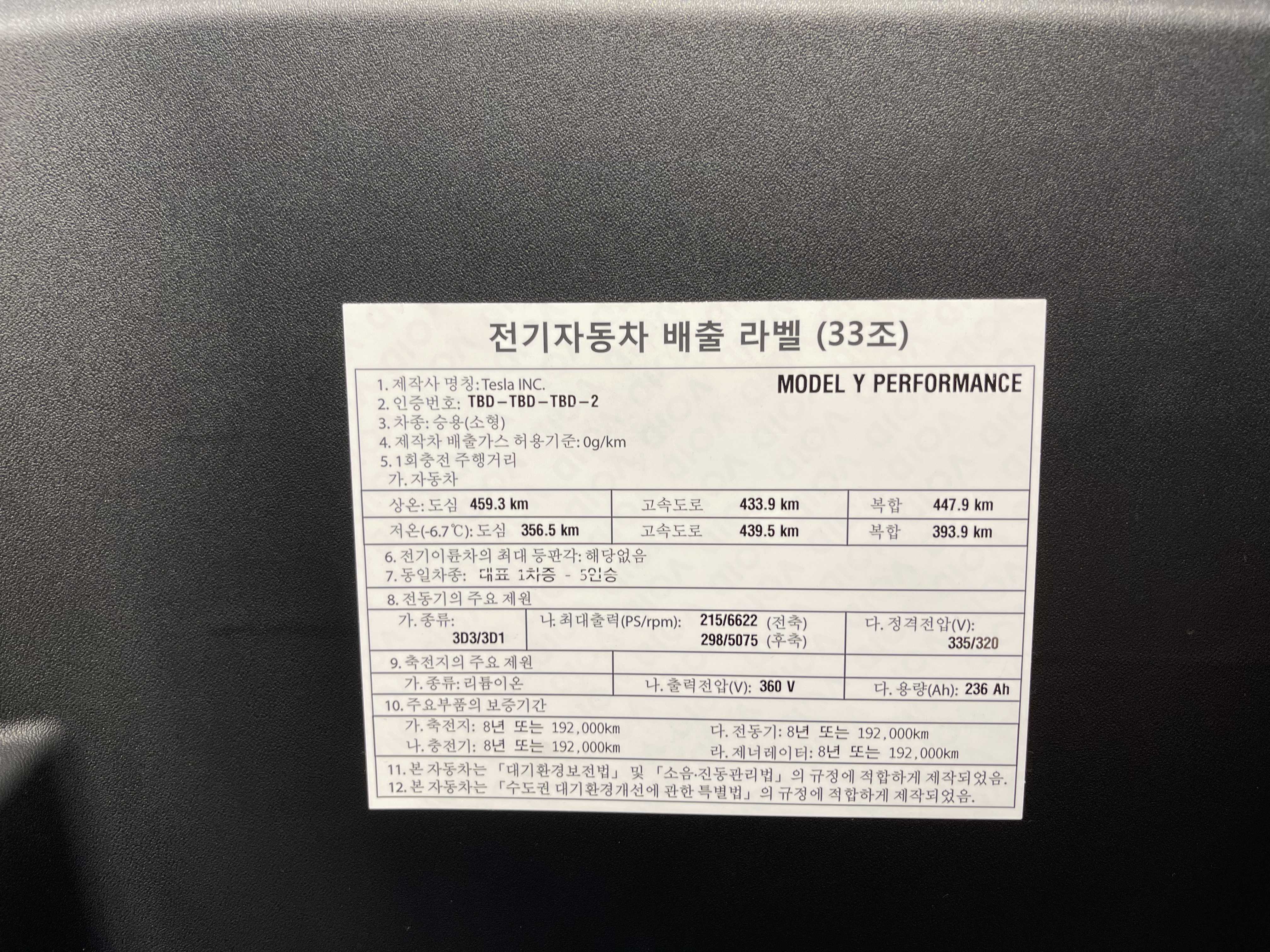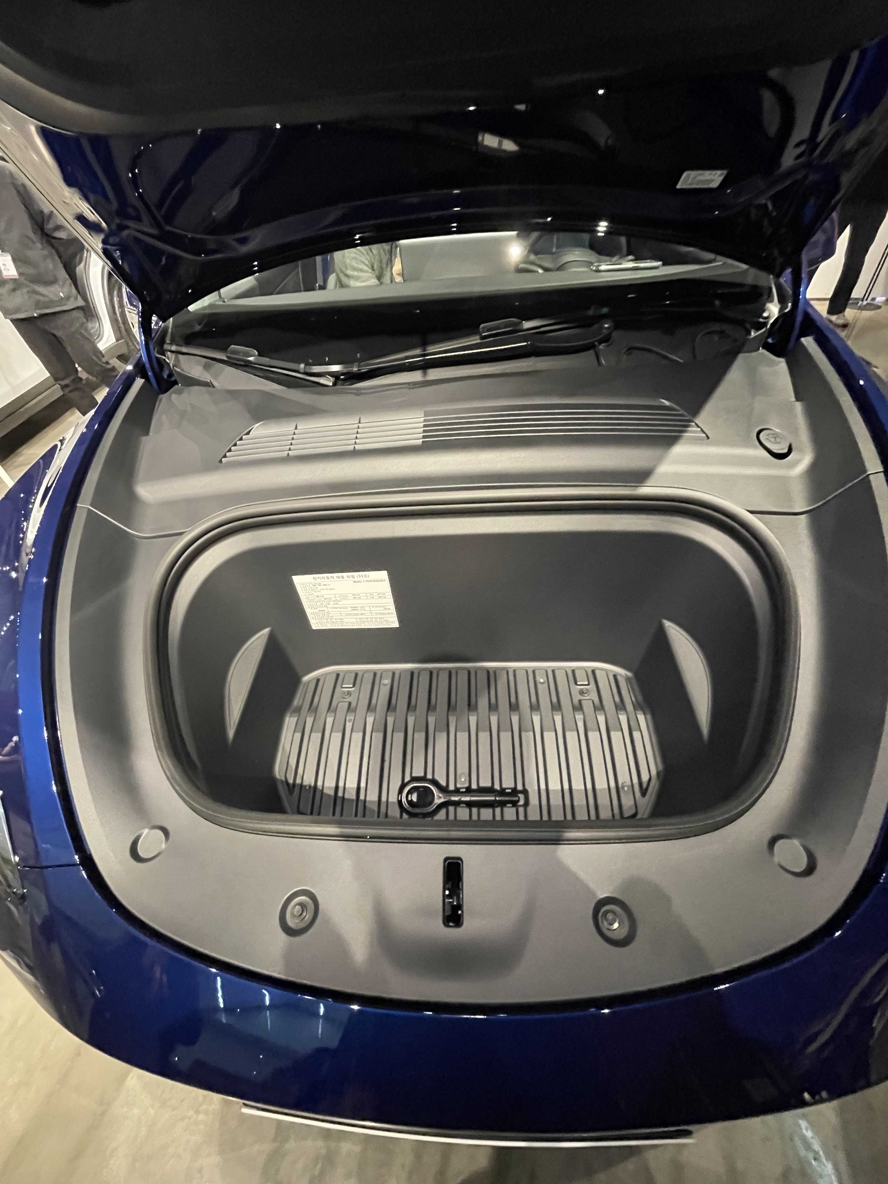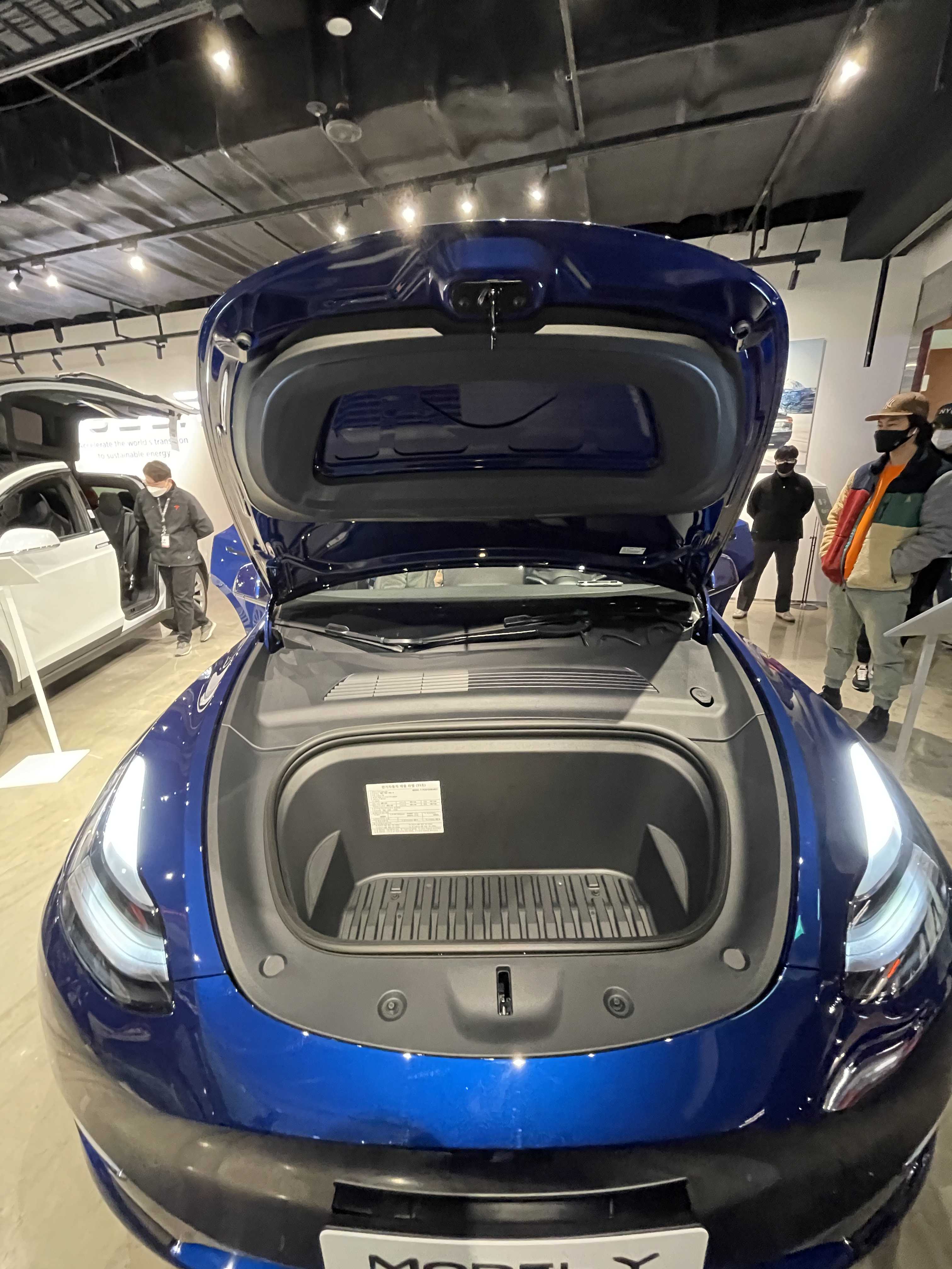 앞모습은 그냥 모델 3 와 같다고 보셔도 무방합니다. 조금 빵빵한 모델 3 라고 생각하시면 됩니다. 프렁크(프런트 트렁크)의 경우는 모델 3 대비 많이 깊어서 사용성이 좋습니다. 프렁크에 전기자동차 배출 라벨이 붙어있는데요. 1회 충전 주행거리 정보가 있습니다. 퍼포먼스라 복합 447.9 Km라고 적혀있네요. 냉간(저온) 시 393.9 Km 약 50 Km 정도 줄어드는 것으로 보이네요. (물론 영하 7도 기준이라 더 추운 요즘 같은 날씨에는 효율이 더 떨어질 수도 있습니다. 히트 펌프의 효과가 어느 정도일지 얼른 타보고 싶네요) 옆에 모델 X가 있어서 비교해 보니 높이가 살짝 낮습니다. 차체 크기는 작지만 모델 Y도 결코 작은 크기는 아니었습니다.