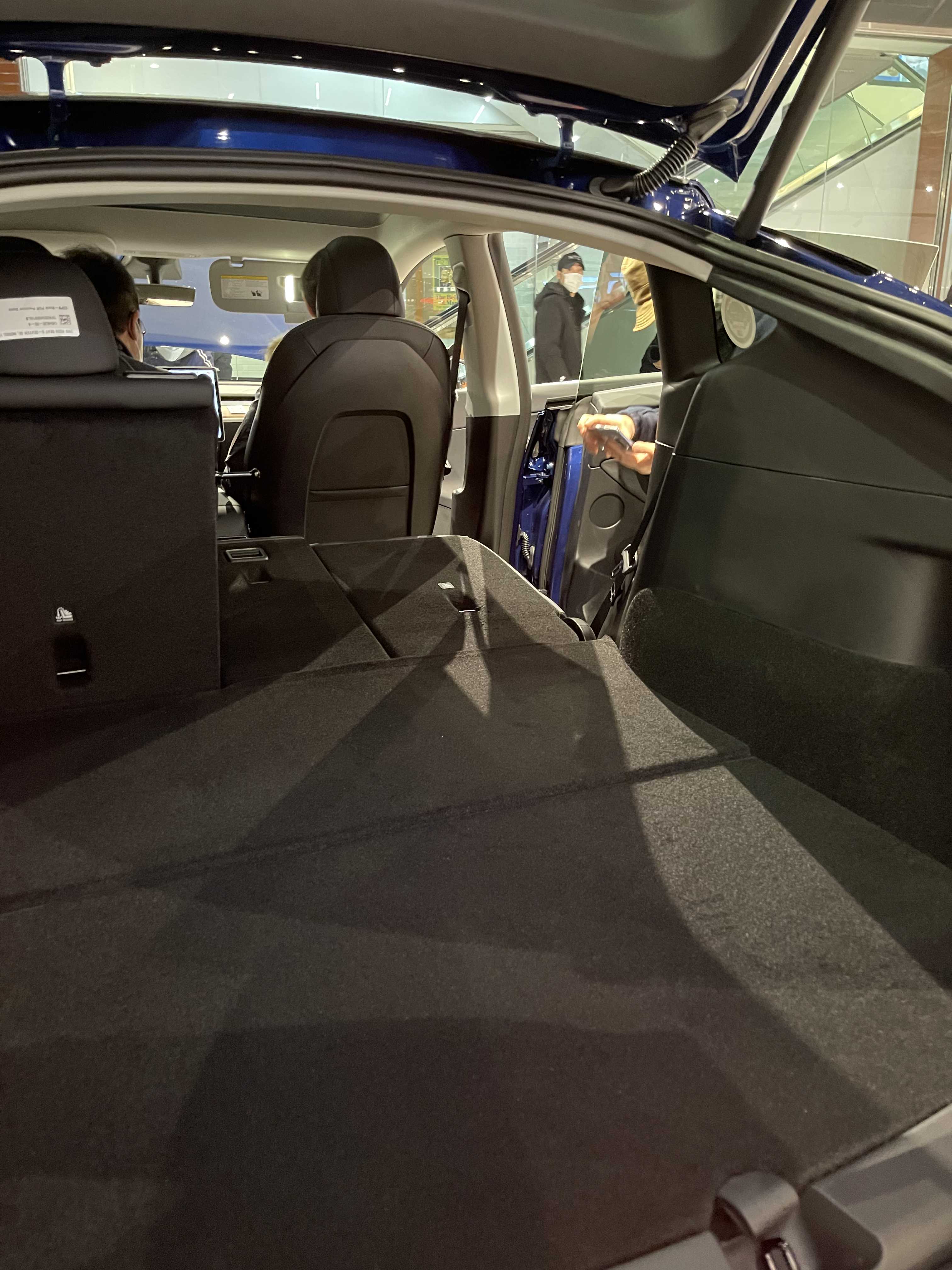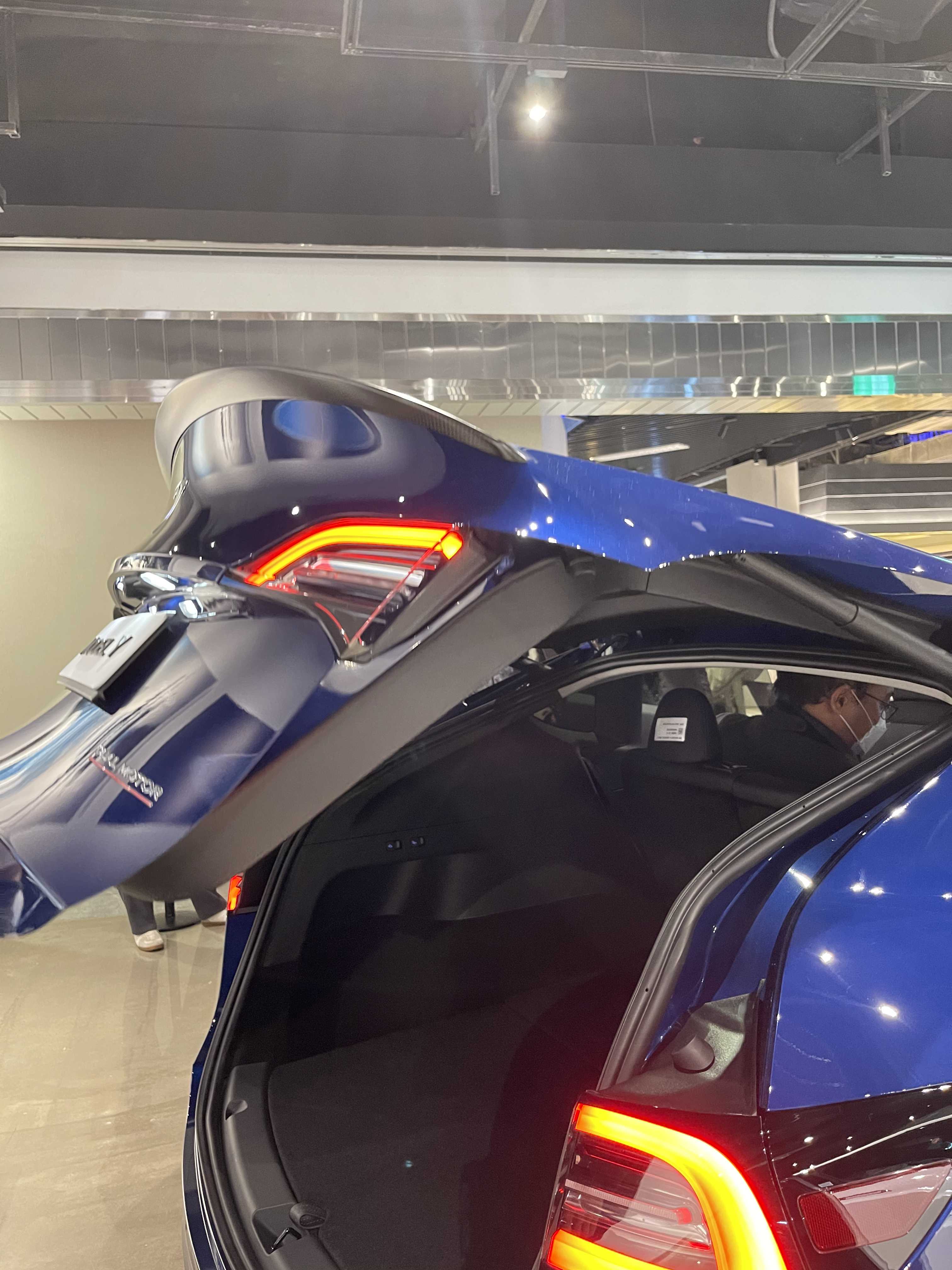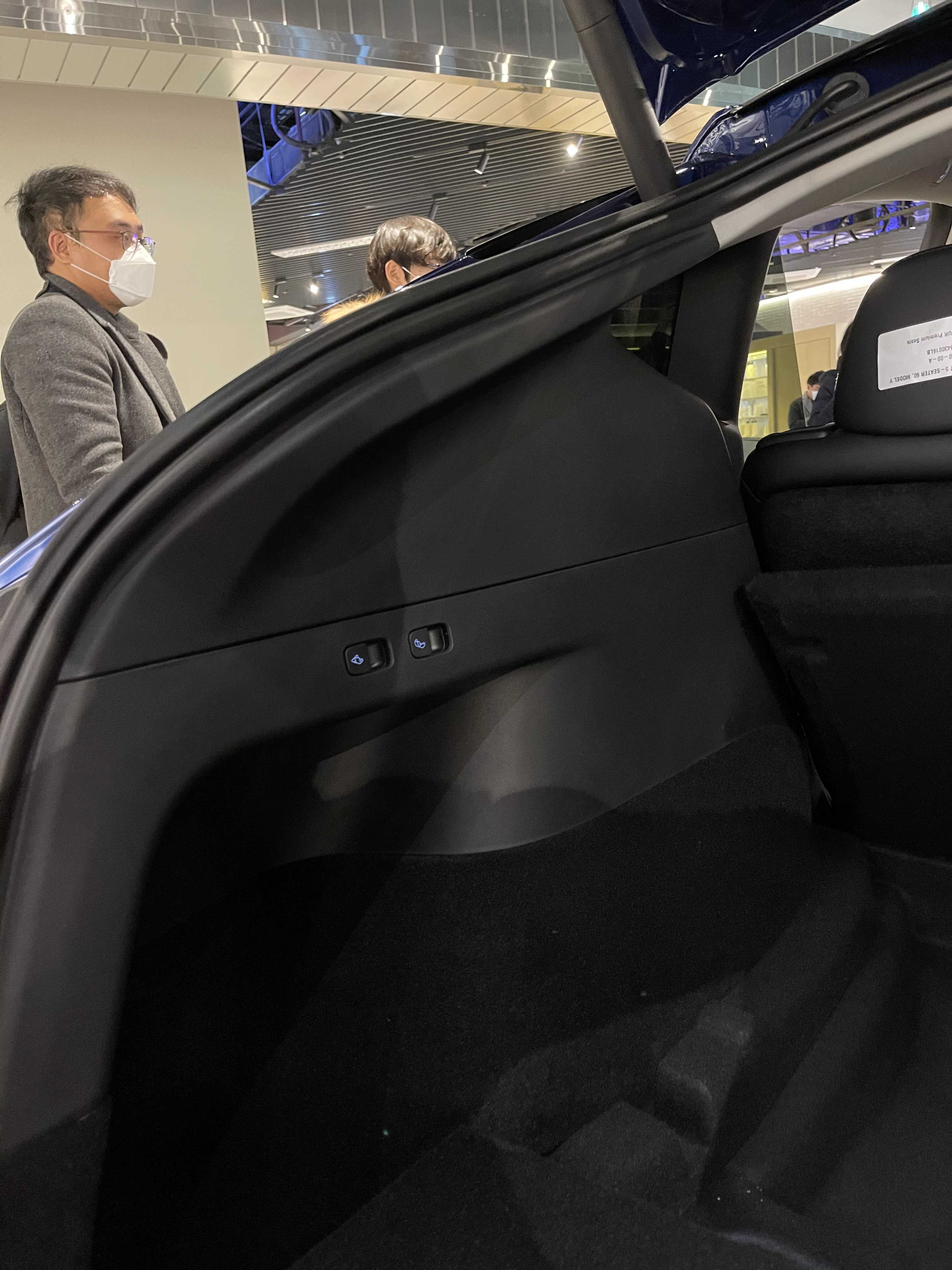 뒷모습은 트렁크 부분의 높이 자체가 SUV이다 보니 높습니다. 퍼포먼스 모델이라 리어 카본 스포일러도 장작 된 모습이네요. 오토 테일게이트가 적용돼서 버튼을 누르면 스르륵! 잘 올라갑니다. 발차기나 제스처를 통해 오픈하는 건 지원하지 않고요. 열린 트렁크 내부 모습은 넓습니다. 지하실? 도 엄청 깊어서 사용성이 뛰어날 것 같습니다. 전시된 모델은 5인승이라 3열이 들어가는 자리에도 지하공간이 마련되어 있습니다. 자잘한 차량용품이나 충전기, 삼각대등을 수납하기 적당해 보입니다. 2열을 접었을 때 180cm 이상의 남성들도 충분히 누을 수 있는 길이가 나옵니다. 성인 2명이 눕기에도 넉넉까지는 아니라도 충분히 가능한 수준이라 차박에도 아주 적합해 보입니다. 누웠을 때 탁 트인 뷰는 덤이겠죠. 트렁크에 2열 시트를 접을 수 있는 버튼이 2개 있습니다. (전동식 아님, 7인승은 전동이라고 하는데 3열이 자동인지 2열이 자동인지는 알려지지 않음) 테슬라 차량답게 좌/우측에 텅 빈 공간도 있고요. 트렁크는 모델 3 대비 매우 넓어서 차박이나 가족용 차로 사용하기에 너무 좋을 것 같습니다.