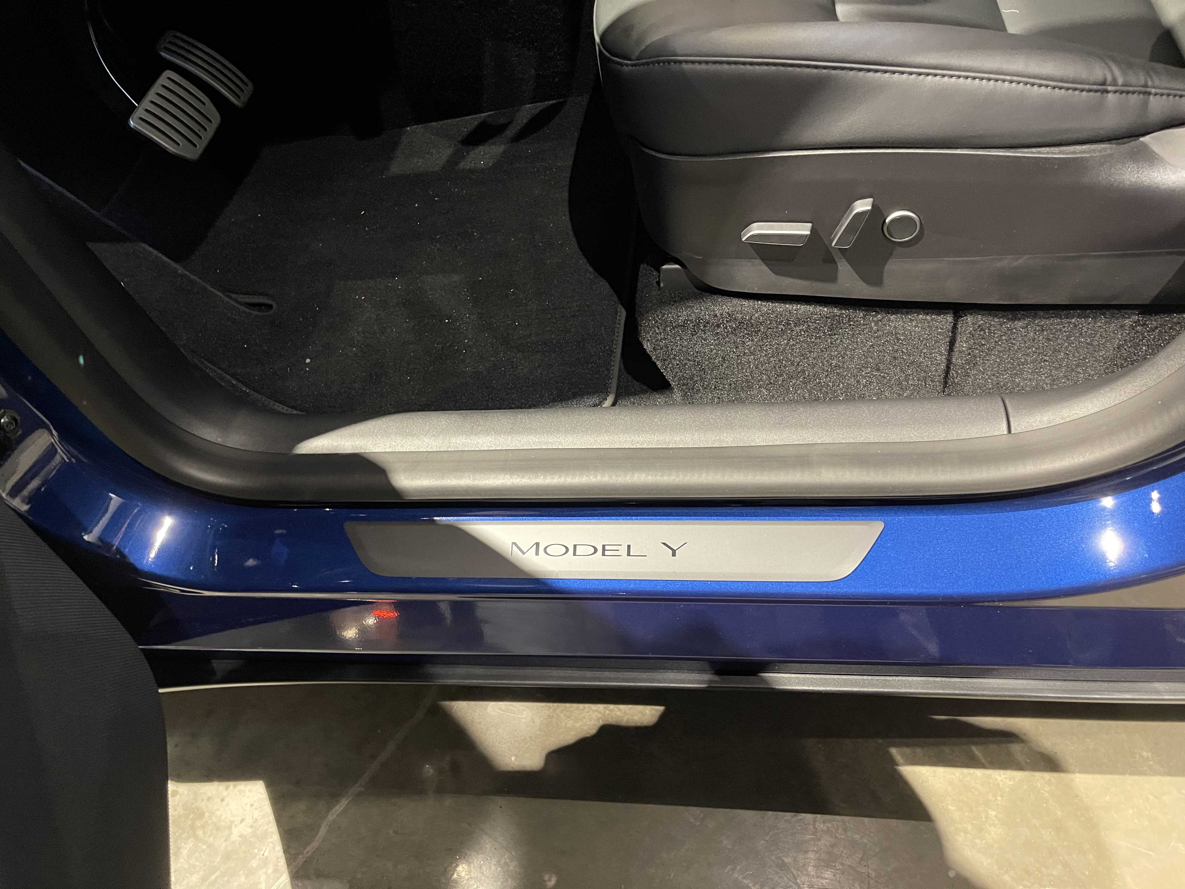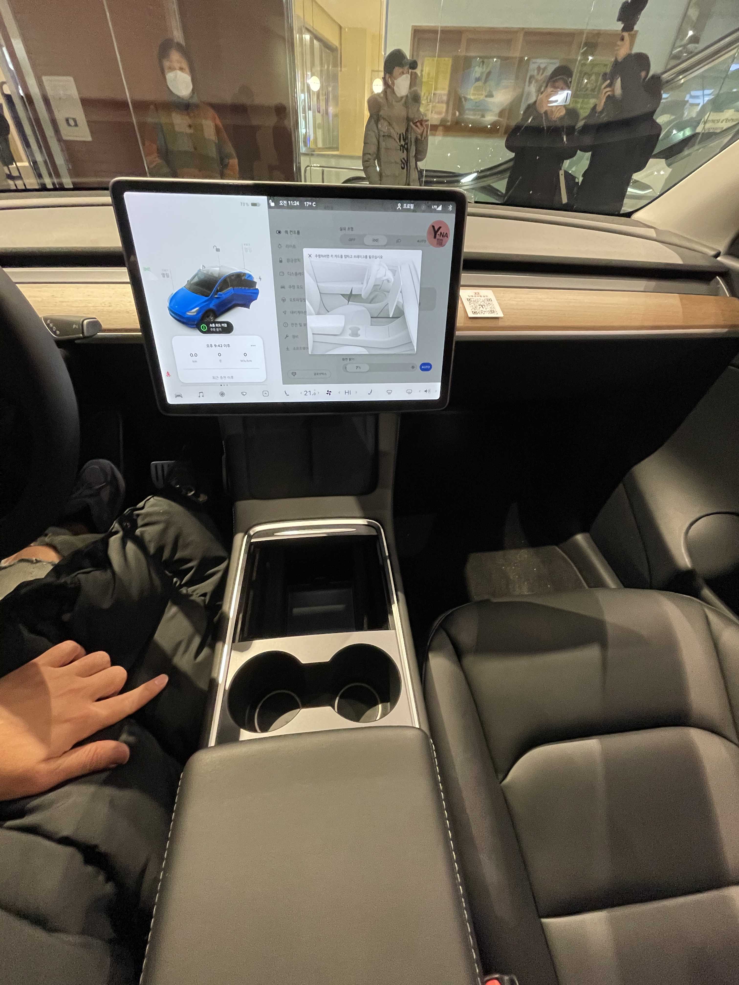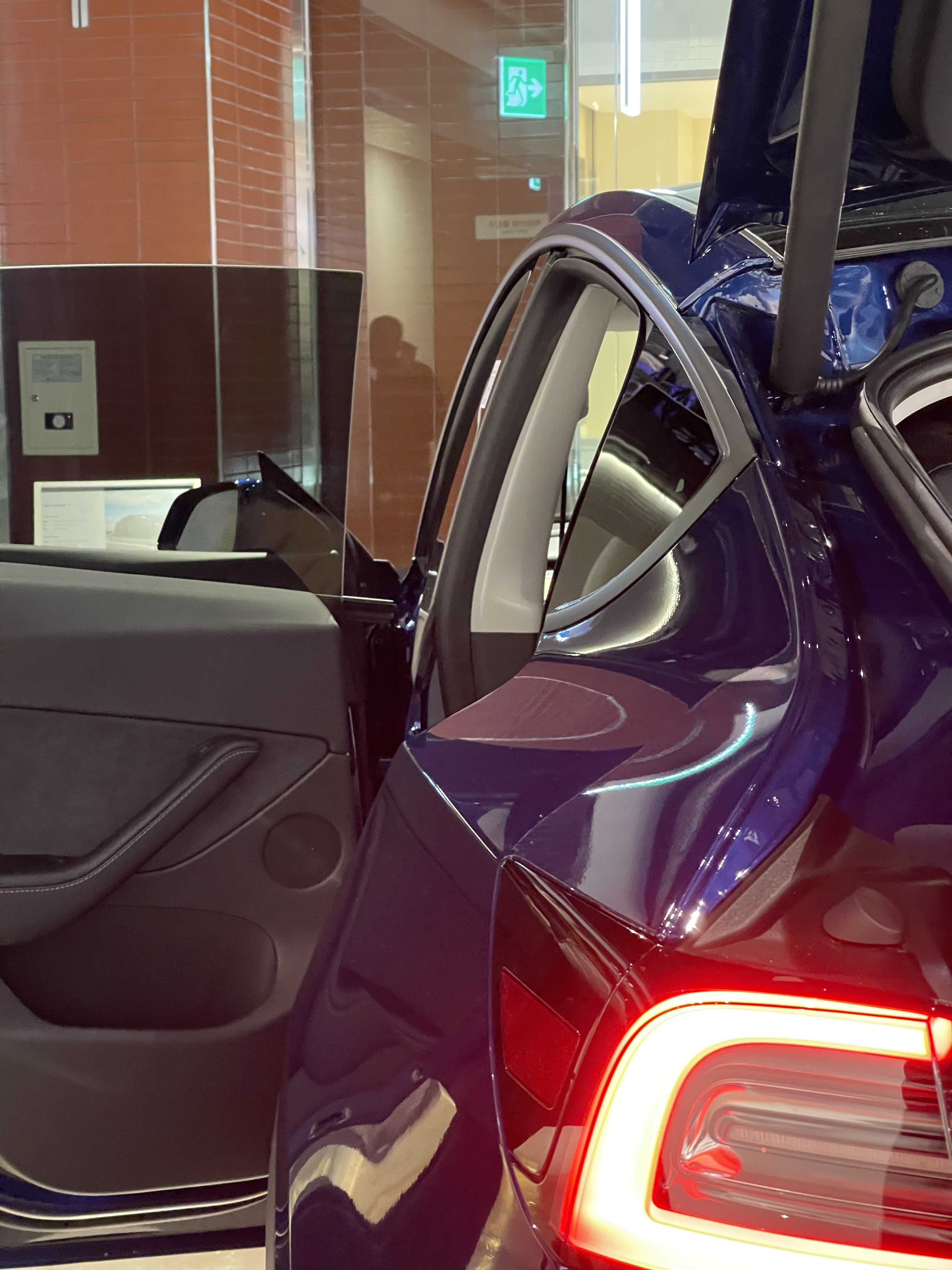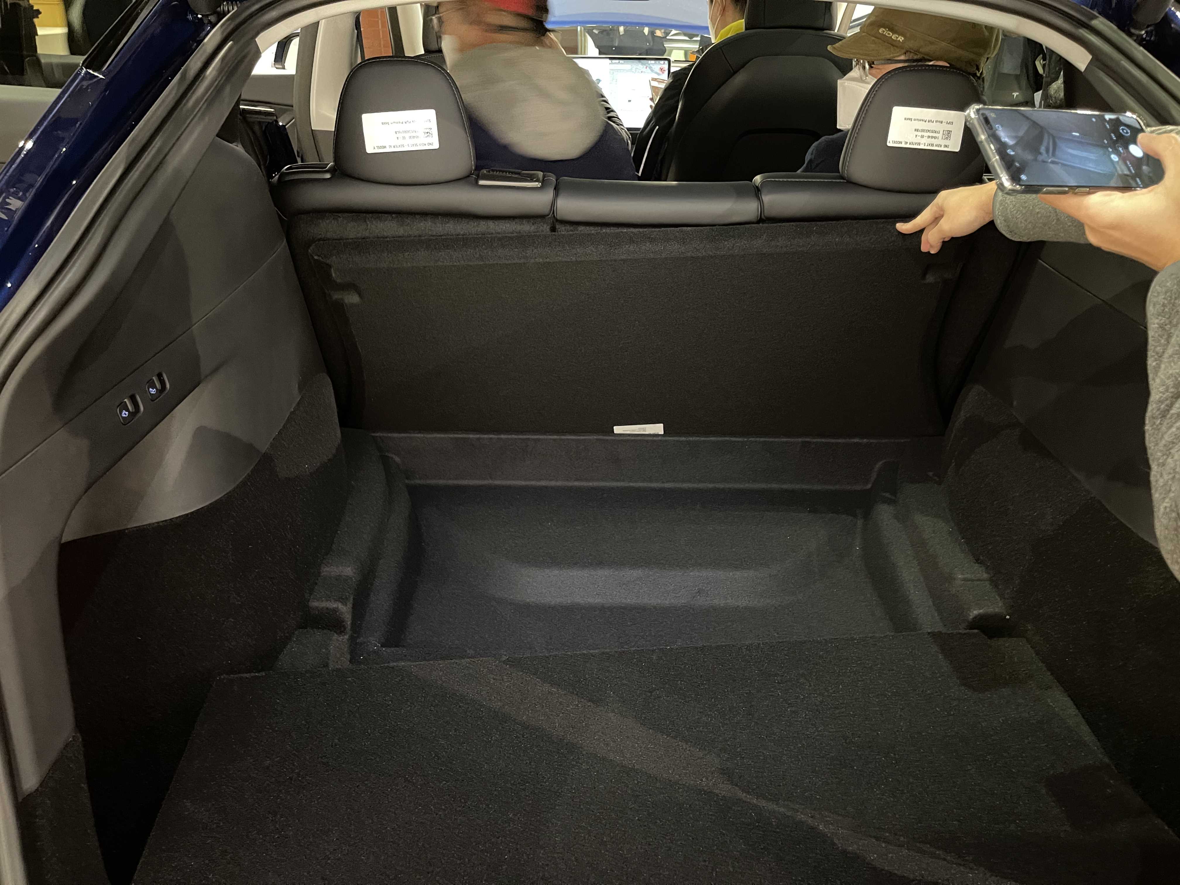 뒷모습은 트렁크 부분의 높이 자체가 SUV이다 보니 높습니다. 퍼포먼스 모델이라 리어 카본 스포일러도 장작 된 모습이네요. 오토 테일게이트가 적용돼서 버튼을 누르면 스르륵! 잘 올라갑니다. 발차기나 제스처를 통해 오픈하는 건 지원하지 않고요. 열린 트렁크 내부 모습은 넓습니다. 지하실? 도 엄청 깊어서 사용성이 뛰어날 것 같습니다. 전시된 모델은 5인승이라 3열이 들어가는 자리에도 지하공간이 마련되어 있습니다. 자잘한 차량용품이나 충전기, 삼각대등을 수납하기 적당해 보입니다. 2열을 접었을 때 180cm 이상의 남성들도 충분히 누을 수 있는 길이가 나옵니다. 성인 2명이 눕기에도 넉넉까지는 아니라도 충분히 가능한 수준이라 차박에도 아주 적합해 보입니다. 누웠을 때 탁 트인 뷰는 덤이겠죠. 트렁크에 2열 시트를 접을 수 있는 버튼이 2개 있습니다. (전동식 아님, 7인승은 전동이라고 하는데 3열이 자동인지 2열이 자동인지는 알려지지 않음) 테슬라 차량답게 좌/우측에 텅 빈 공간도 있고요. 트렁크는 모델 3 대비 매우 넓어서 차박이나 가족용 차로 사용하기에 너무 좋을 것 같습니다.