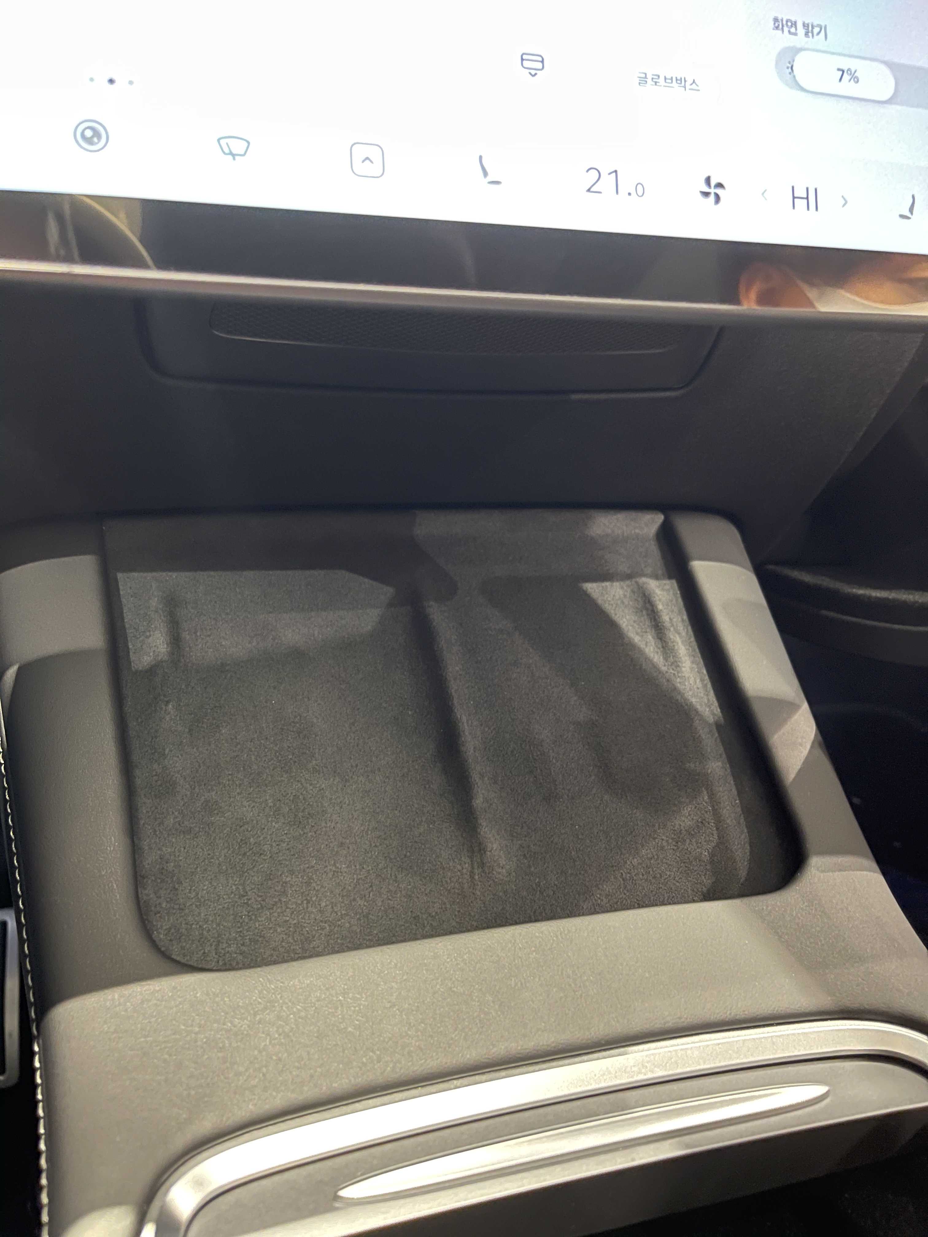 센터 콘솔에 폰 무선충전이 기본 적용되고 덮개가 없는 방식으로 바뀌었고, 컵홀더나 수남 공간의 디자인과 마감 퀄리티도 기존 블랙 하이그로시 보다 훨씬 좋아졌습니다. (약간 고급져 보였습니다, 약간.. 약간) 전시된 모델은 퍼포먼스라 알루미늄 알로이 페달이 적용되어 있는데요. 롱 레인지나 스탠더드의 경우 적용되지 않는 부분입니다.