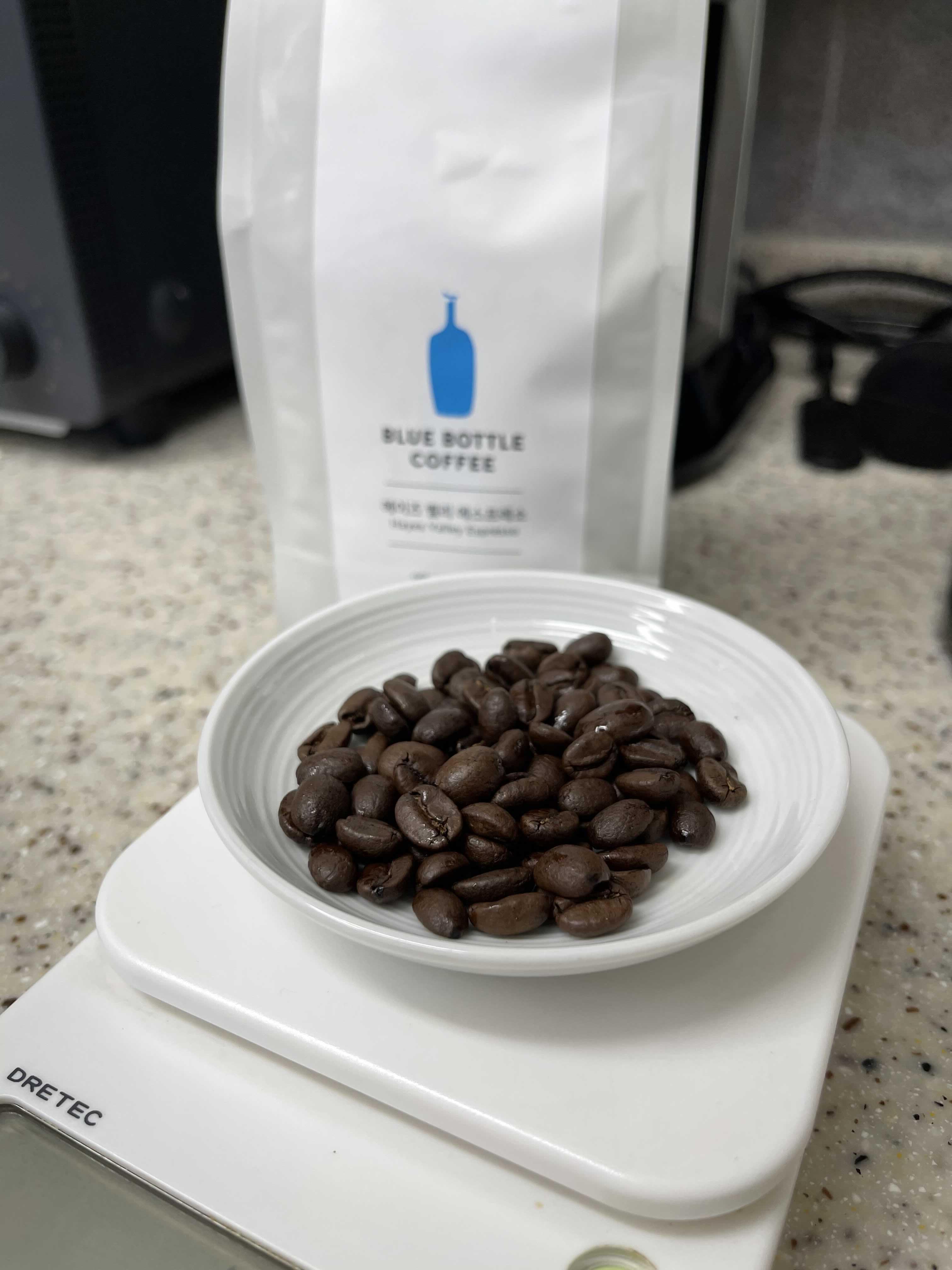 지금까지 먹어본 블루보틀 원두 중 가장 다크 했습니다. 약간의 유분도 보입니다.
